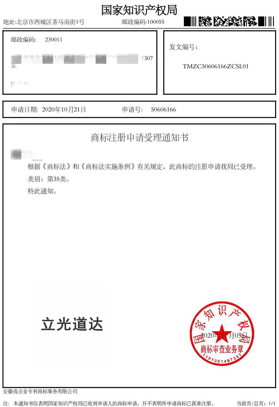 第35类“立光道达”受理通知书