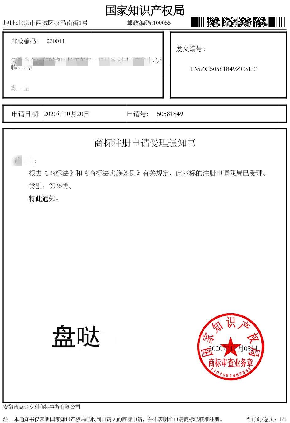 第35类“盘哒”受理通知书