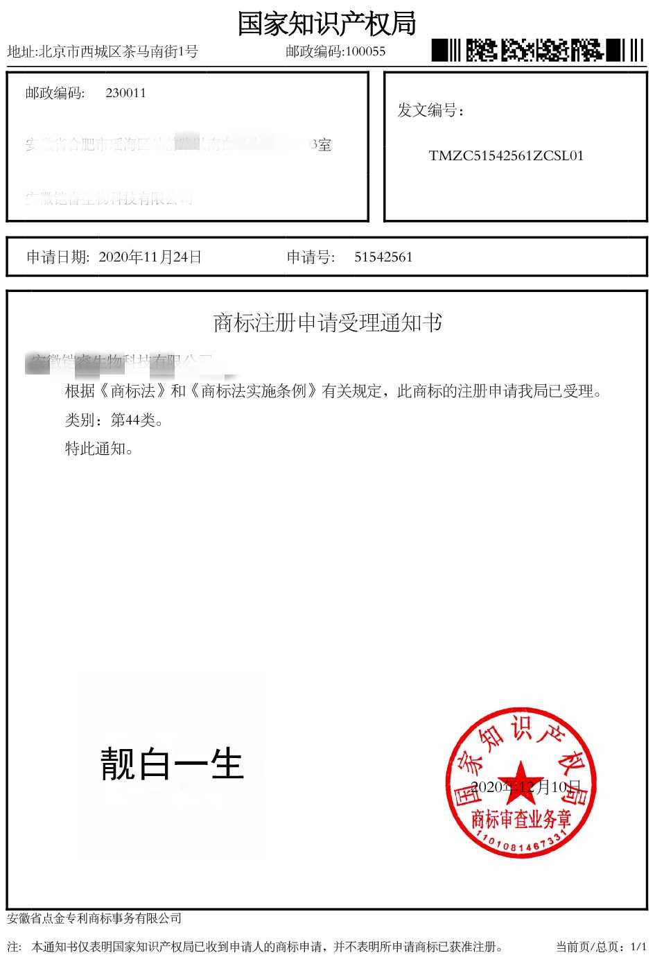 第44类“靓白一生”受理通知书