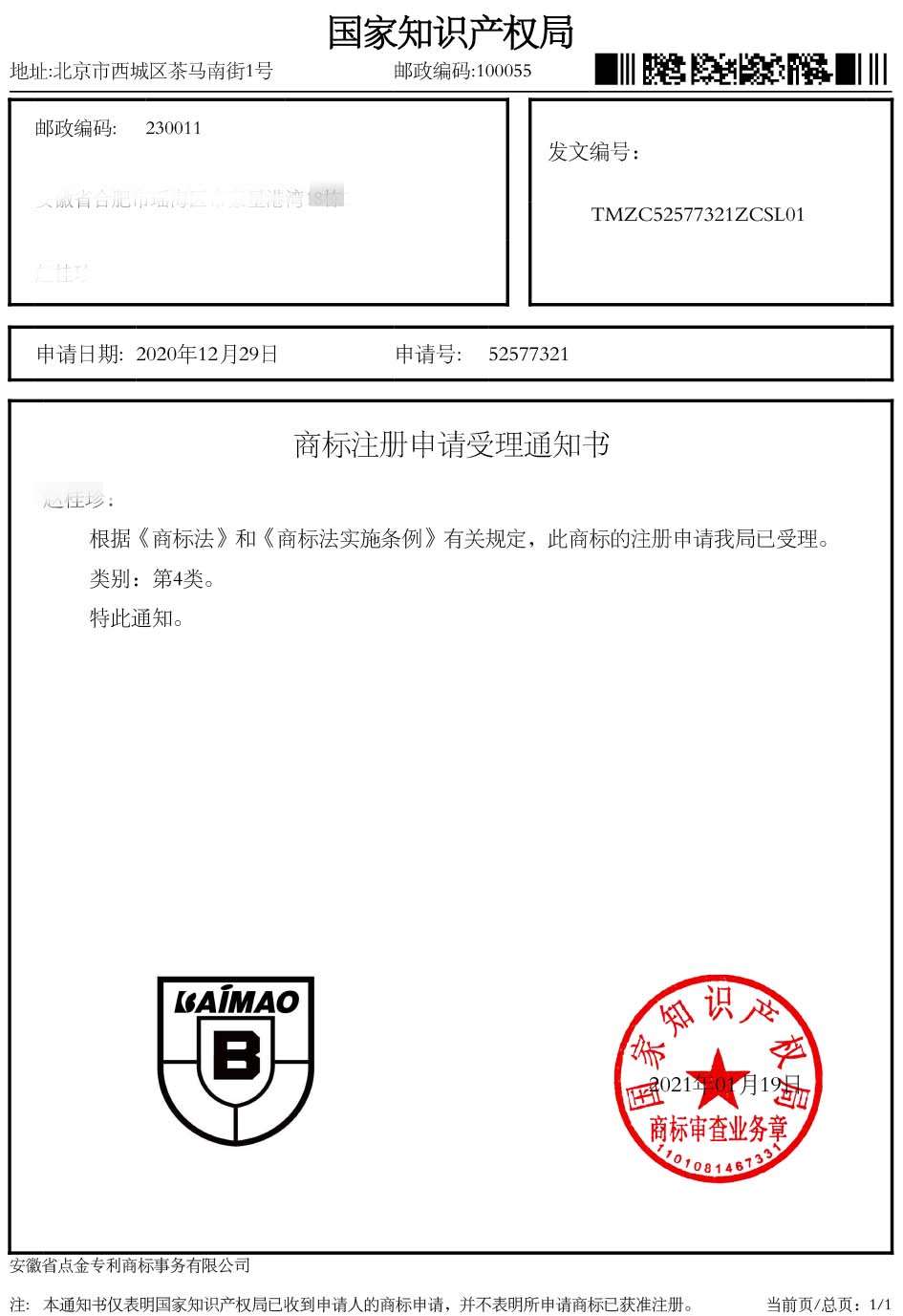 第4类“BAIMAO”受理通知书