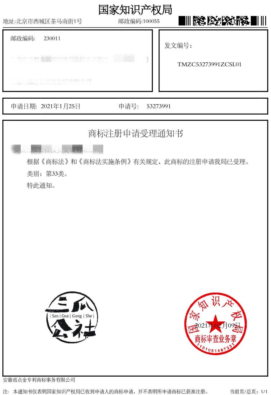 第33类“三瓜公社”受理通知书