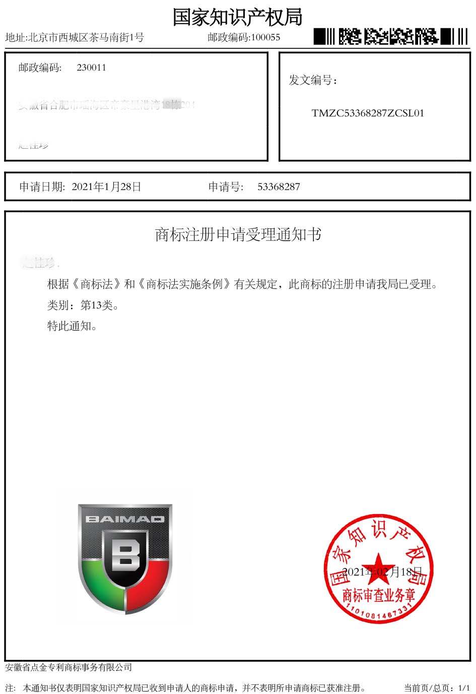第13类“BAIMAO及图形”受理通知书