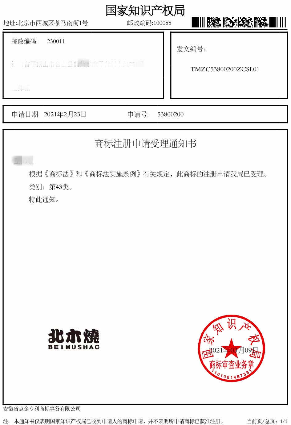 第43类“北木烧”受理通知书