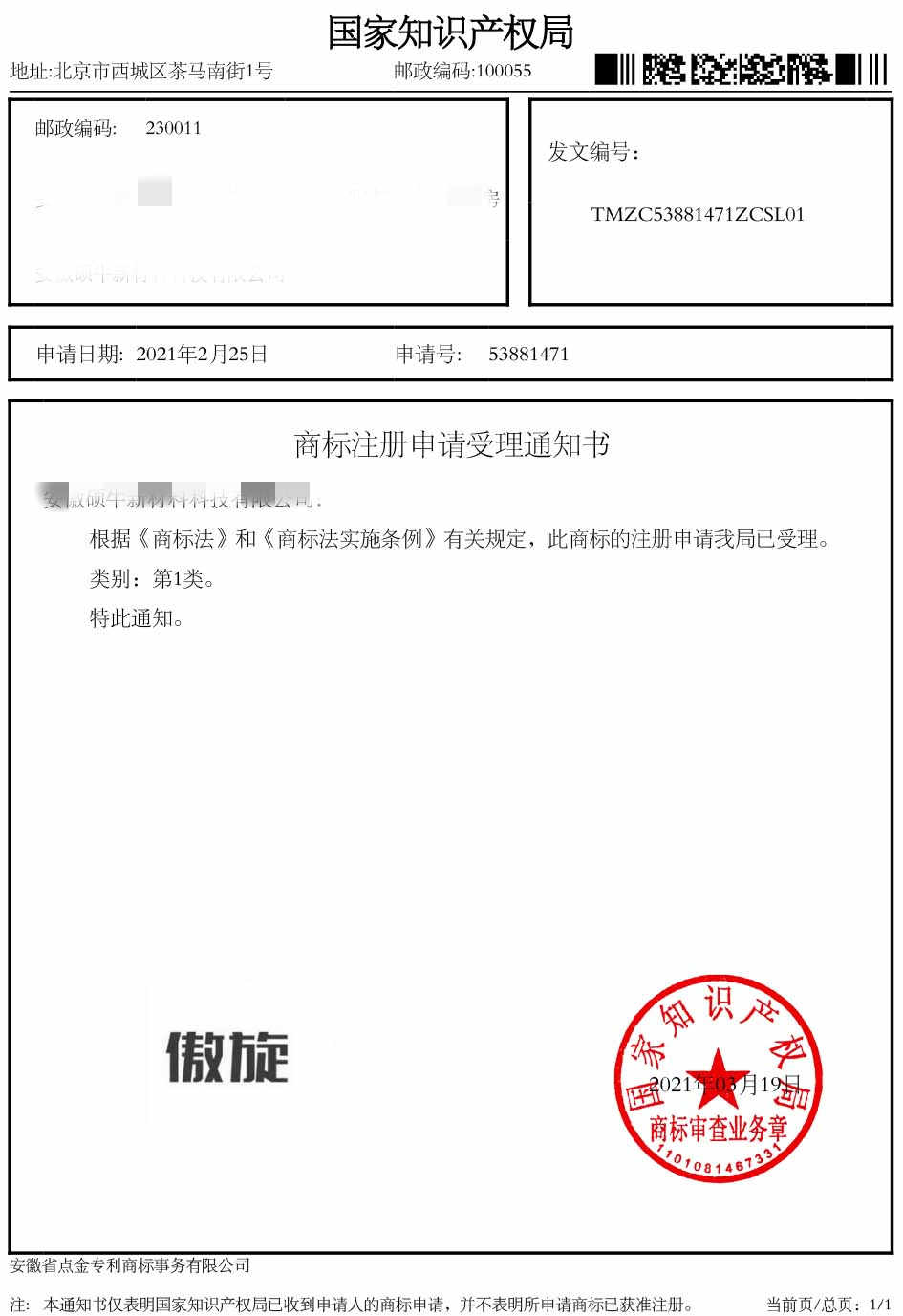 第1类“傲旋”受理通知书