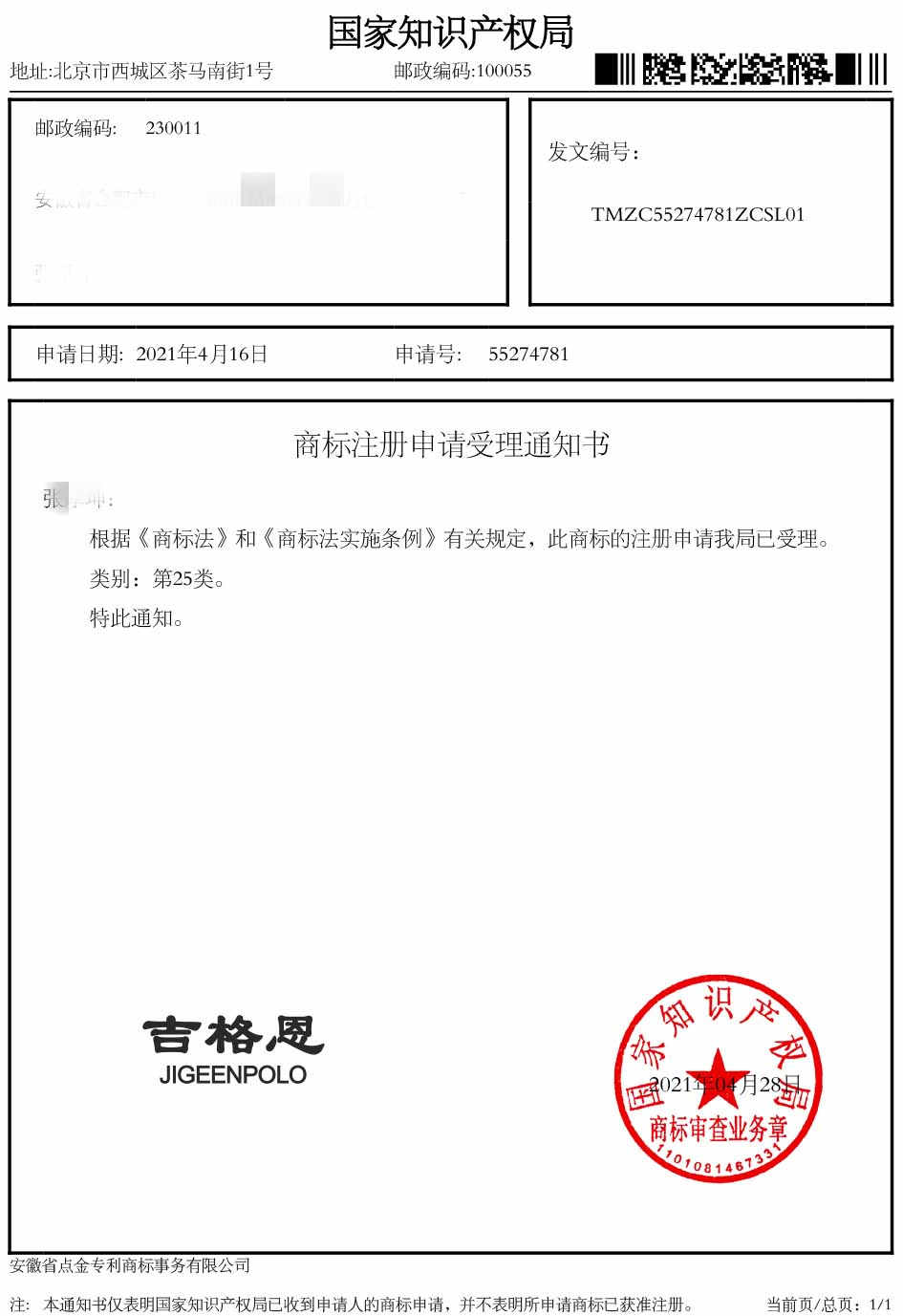 第25类“吉格恩”受理通知书