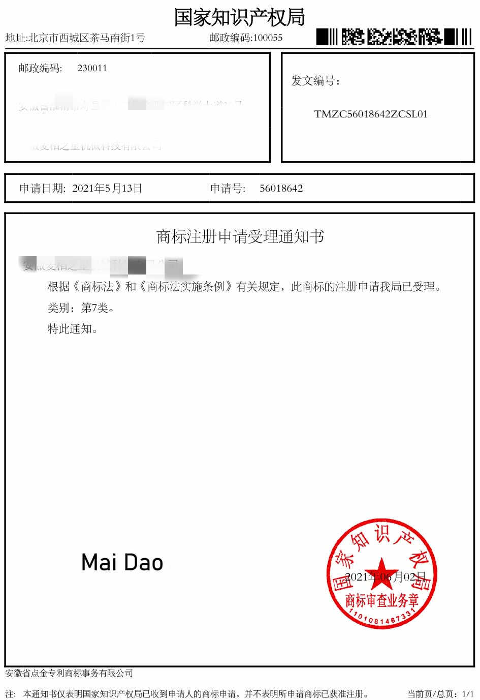 第7类“MAI DAO”受理通知书