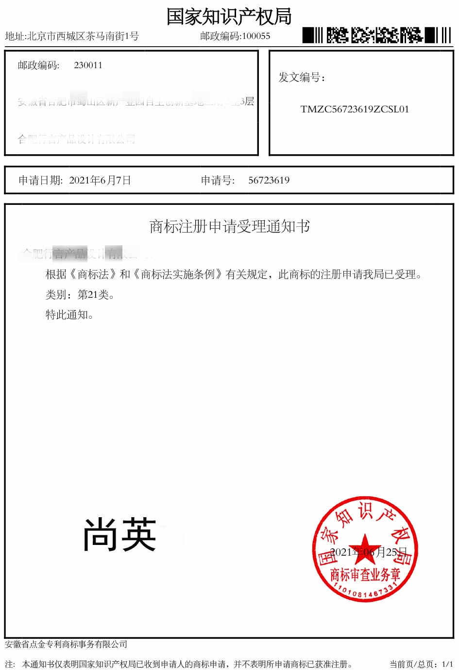 第21类“尚英”受理通知书