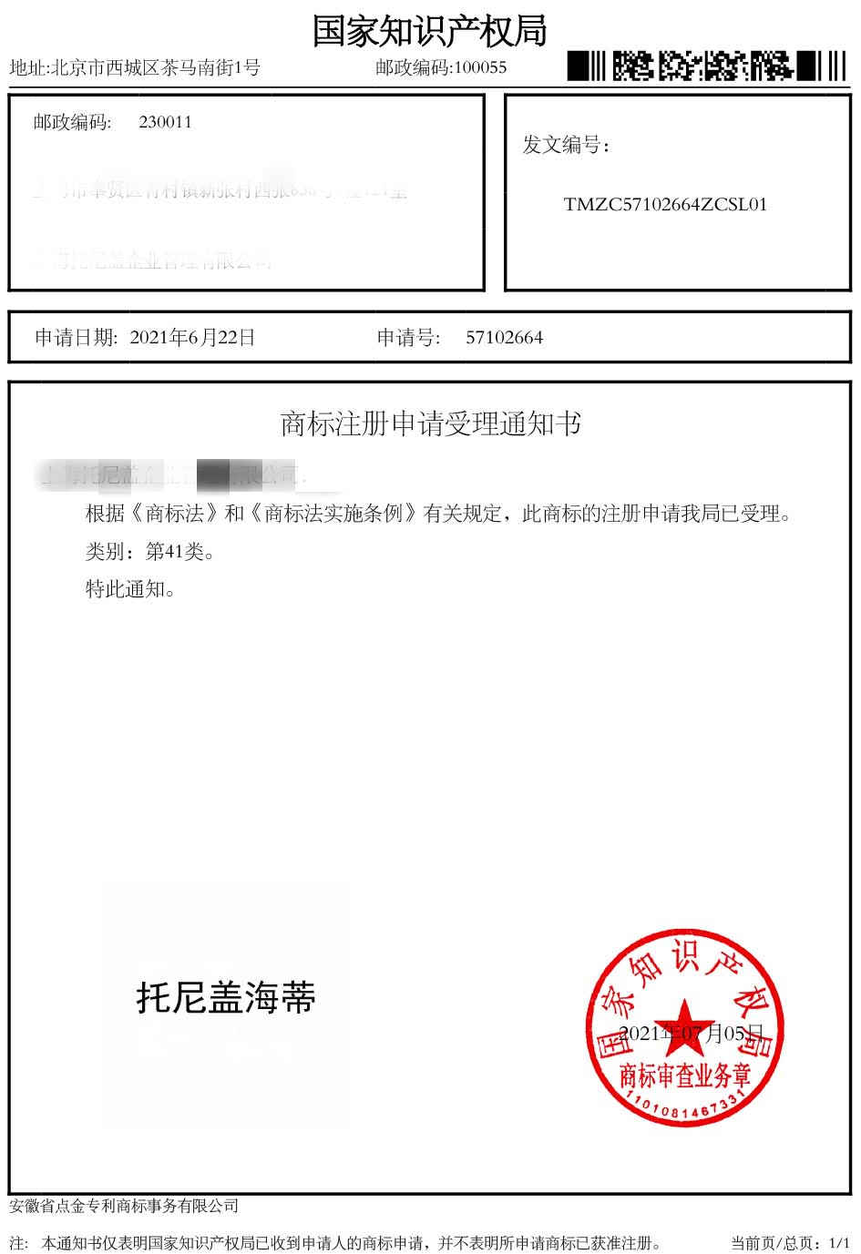 第41类“托尼盖海蒂”受理通知书