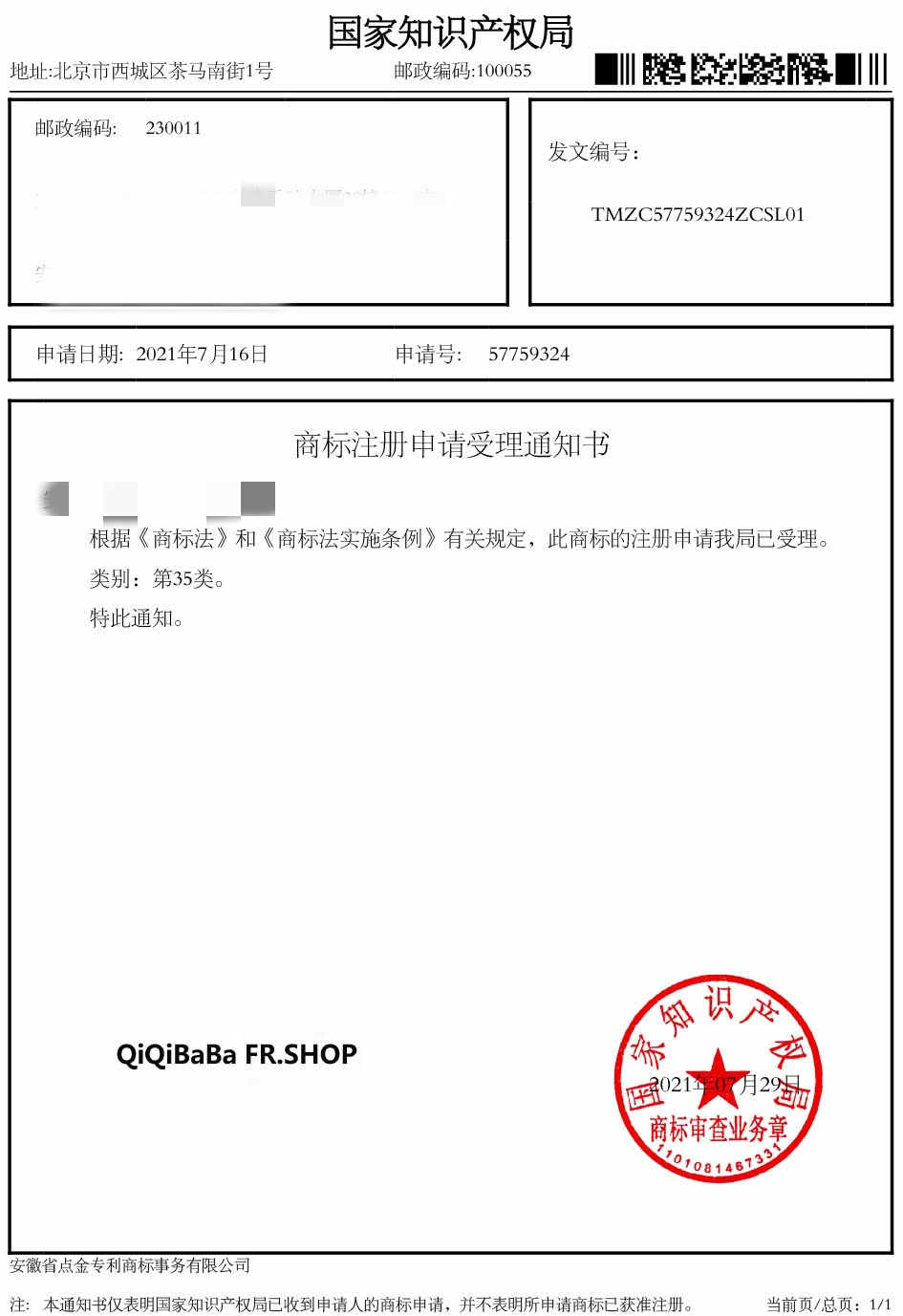 第35类“QiQiBaBa FR.SHOP”商标受理通知书