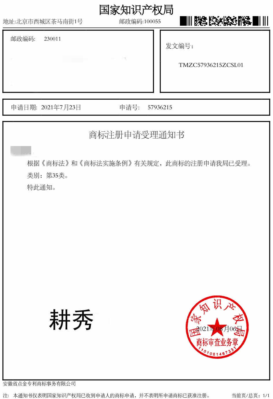 第35类“耕秀”商标受理通知书
