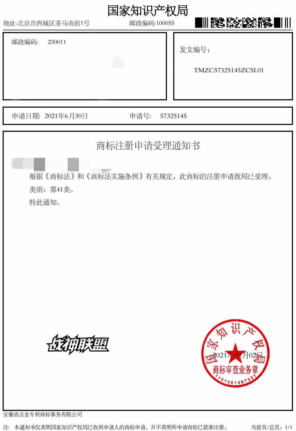 第41类“战神联盟”商标受理通知书