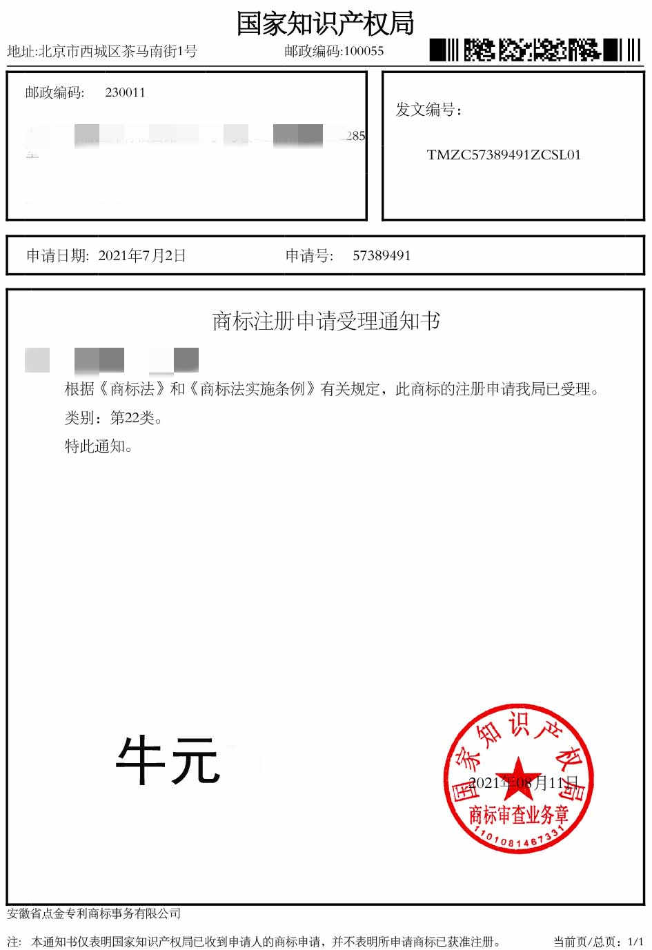 第22类“牛元”商标受理通知书