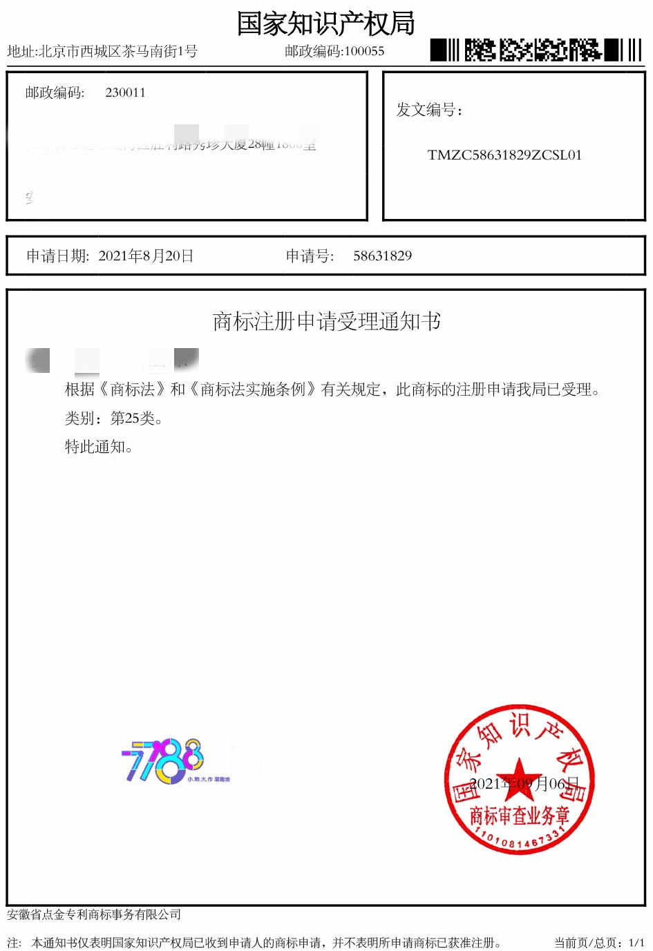 第25类“7788 小物大作 潮趣地”商标受理通知书
