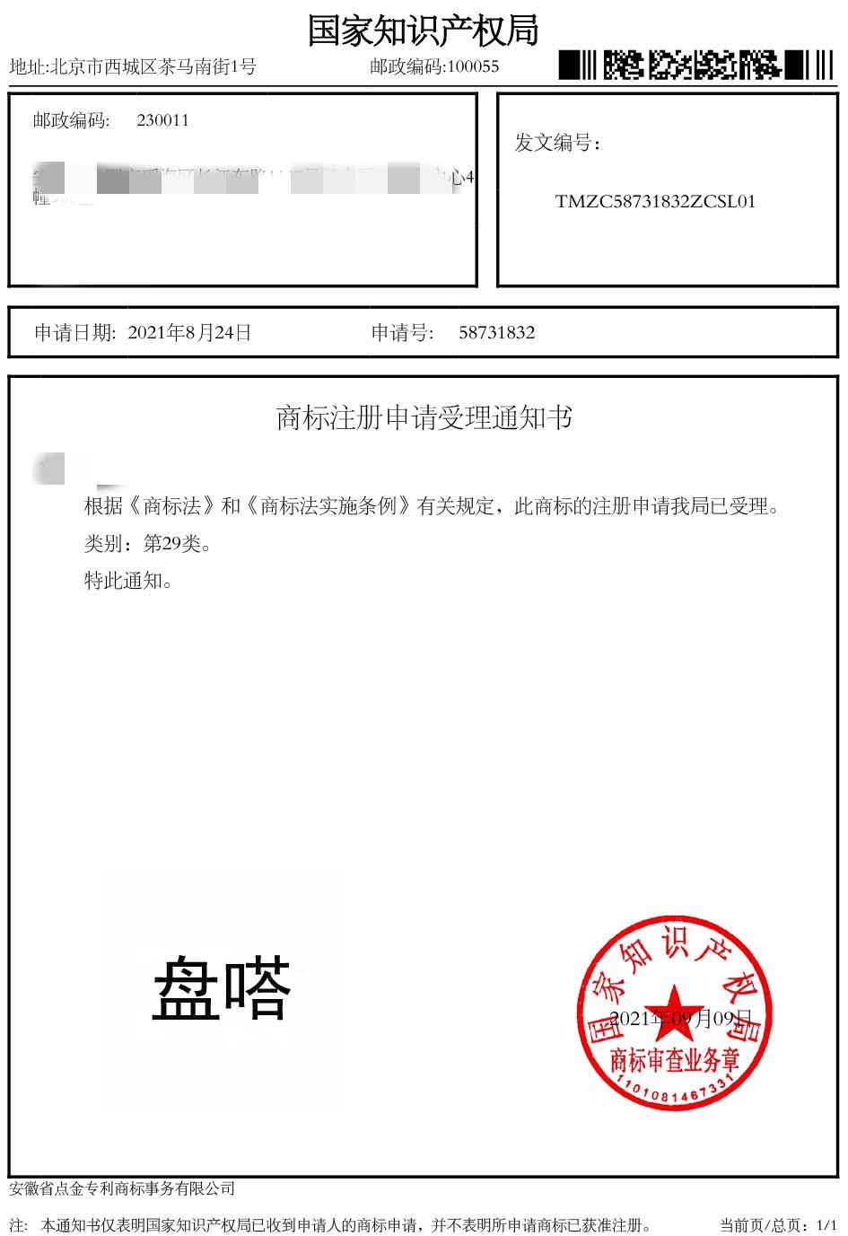 第29类“盘嗒”商标受理通知书