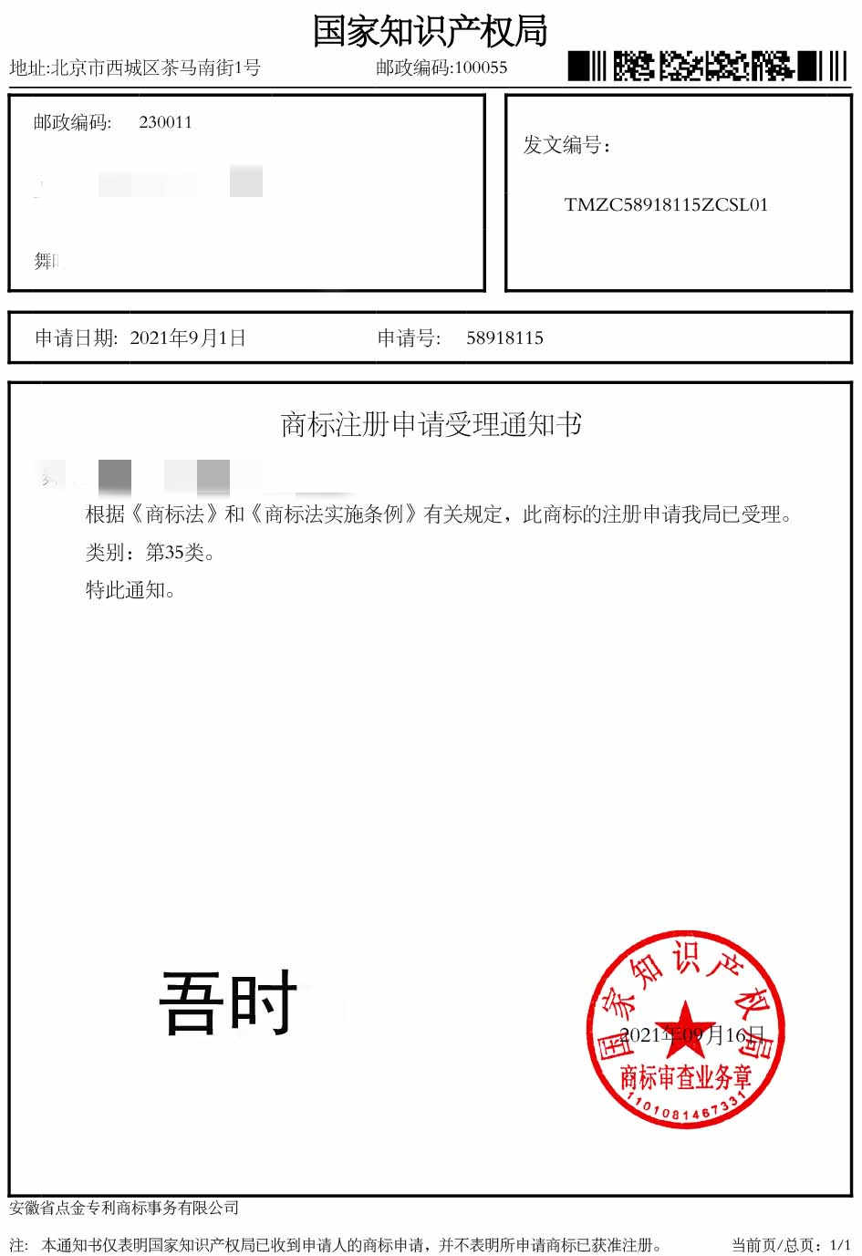 第35类“吾时”商标受理通知书