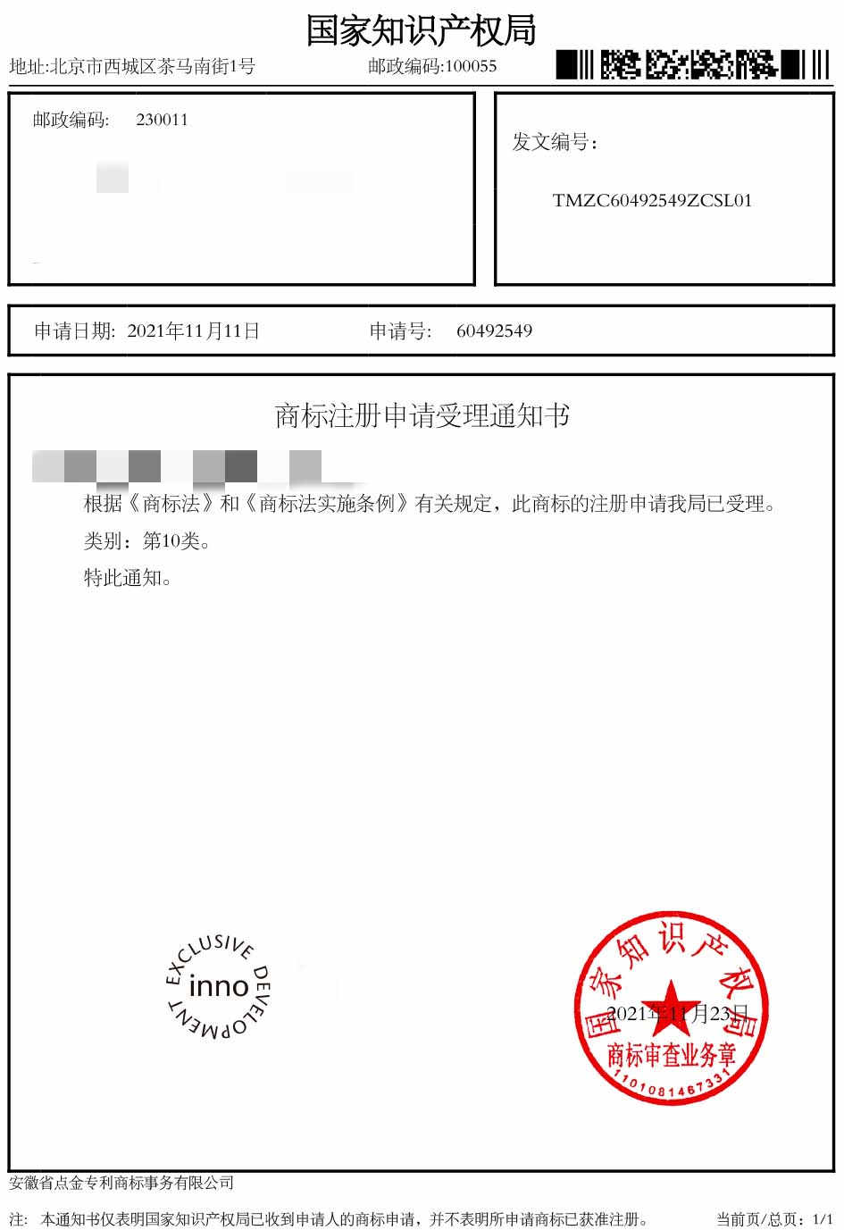 第10类“INNO EXCLUSIVE DEVELOPMENT”商标受理通知书