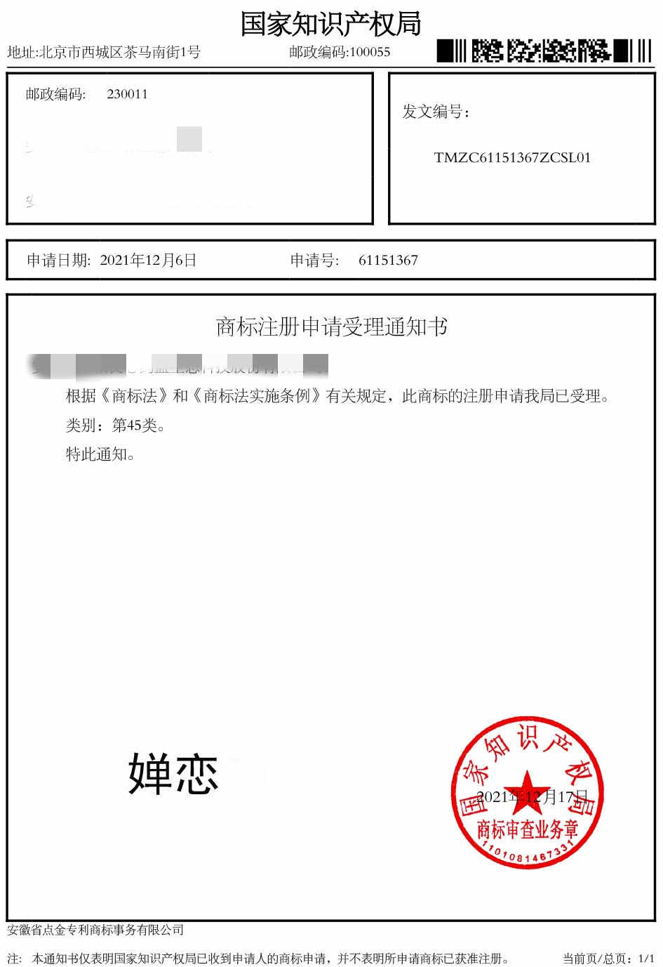 第45类“婵恋”商标受理通知书