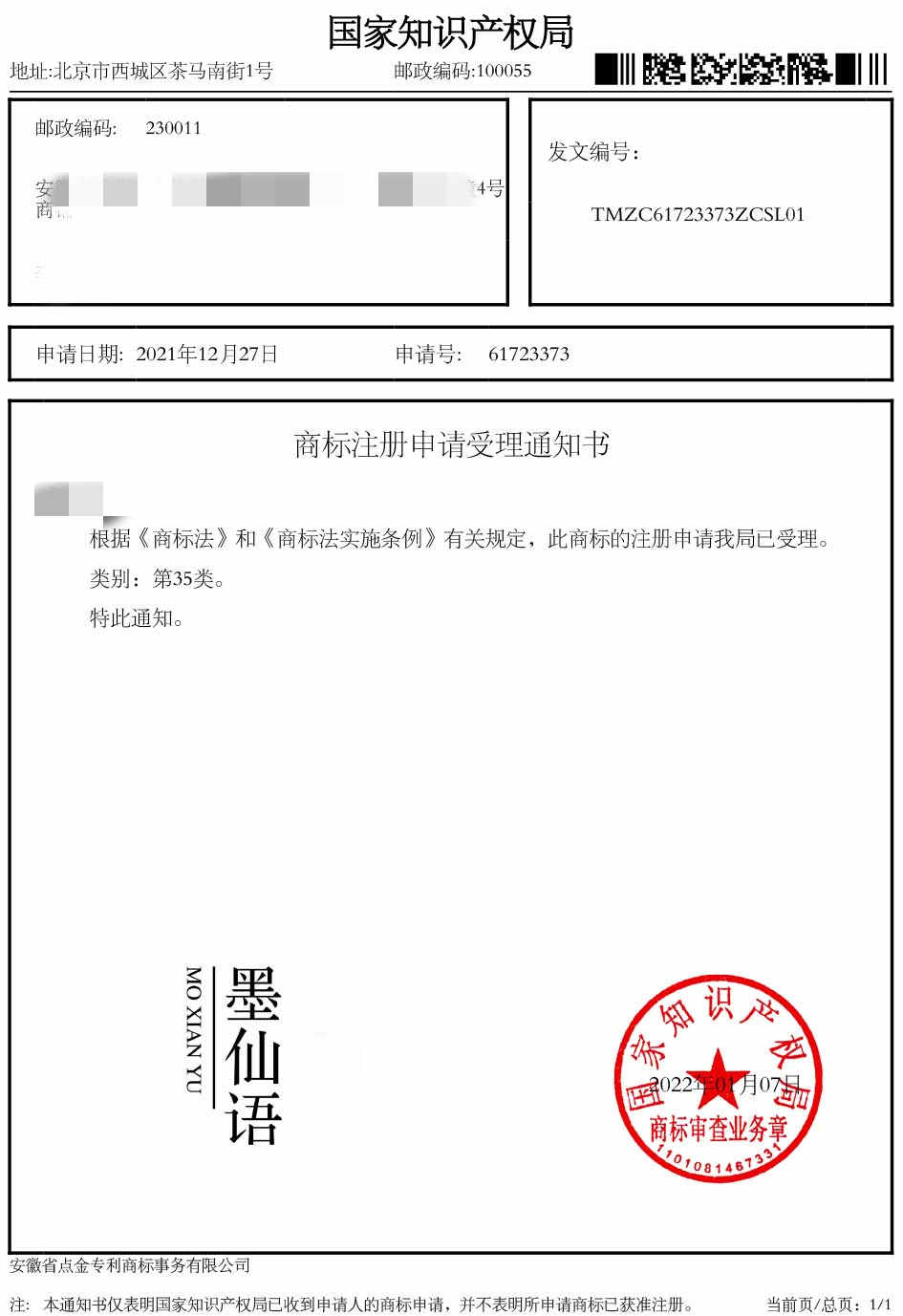 第35类“墨仙语”商标受理通知书