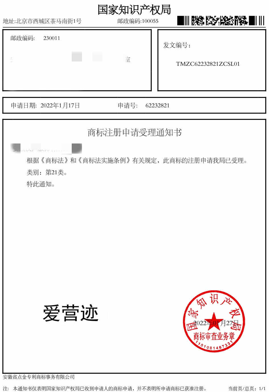 第21类“爱营迹”商标受理通知书
