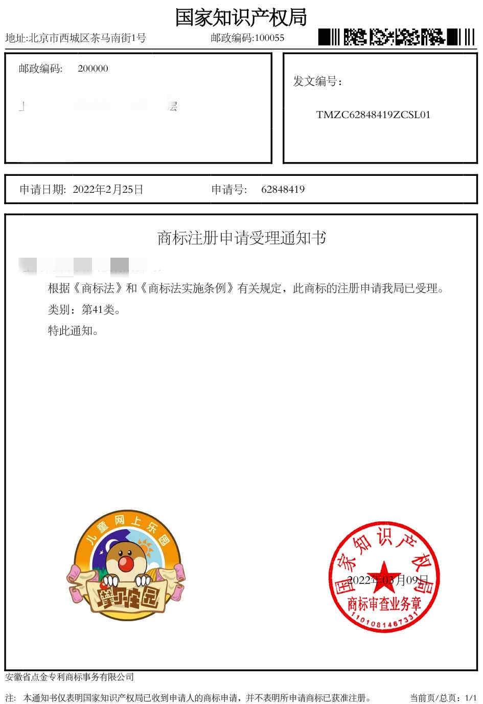 第41类“儿童网上乐园”商标受理通知书