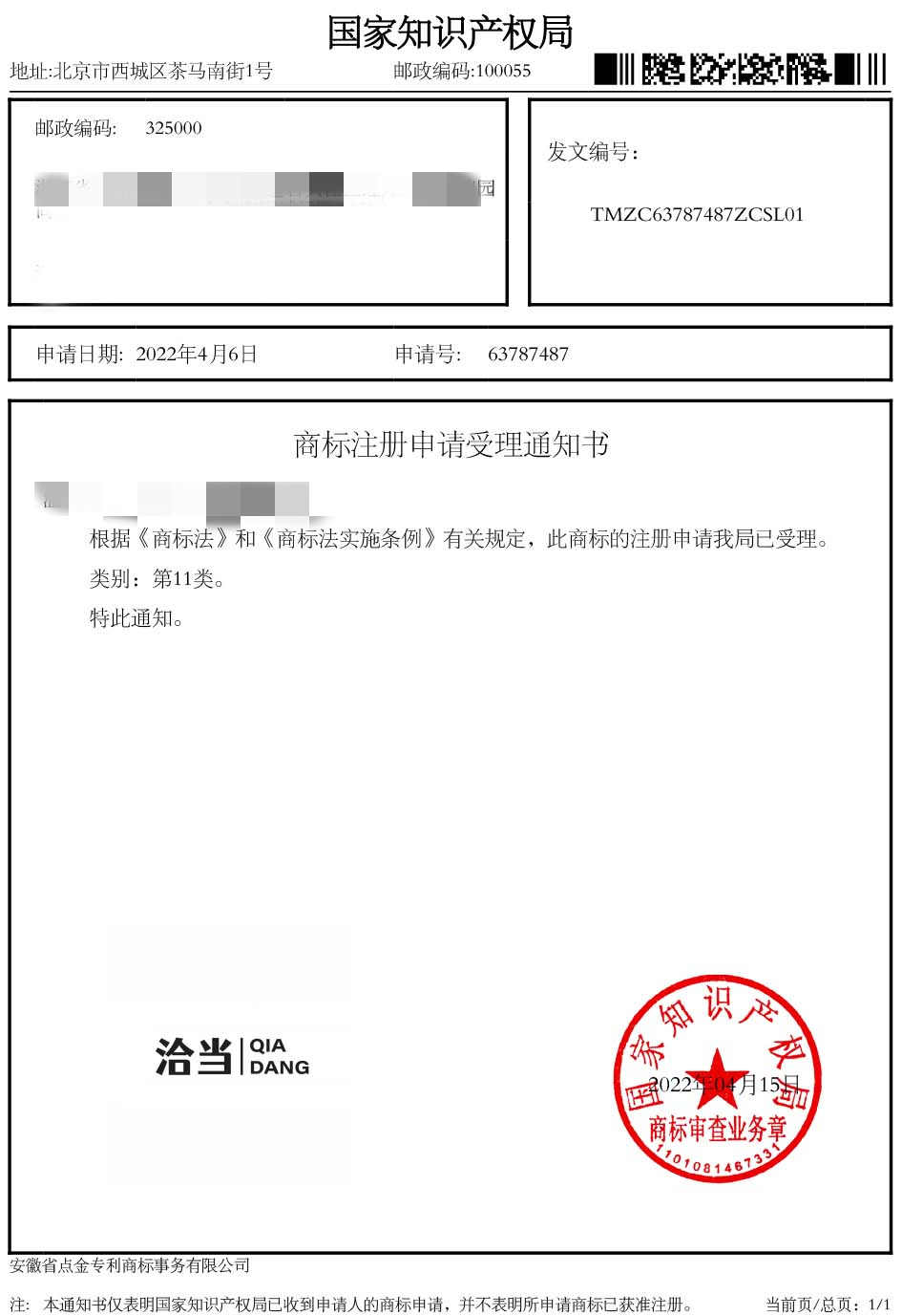 第11类“洽当”商标受理通知书