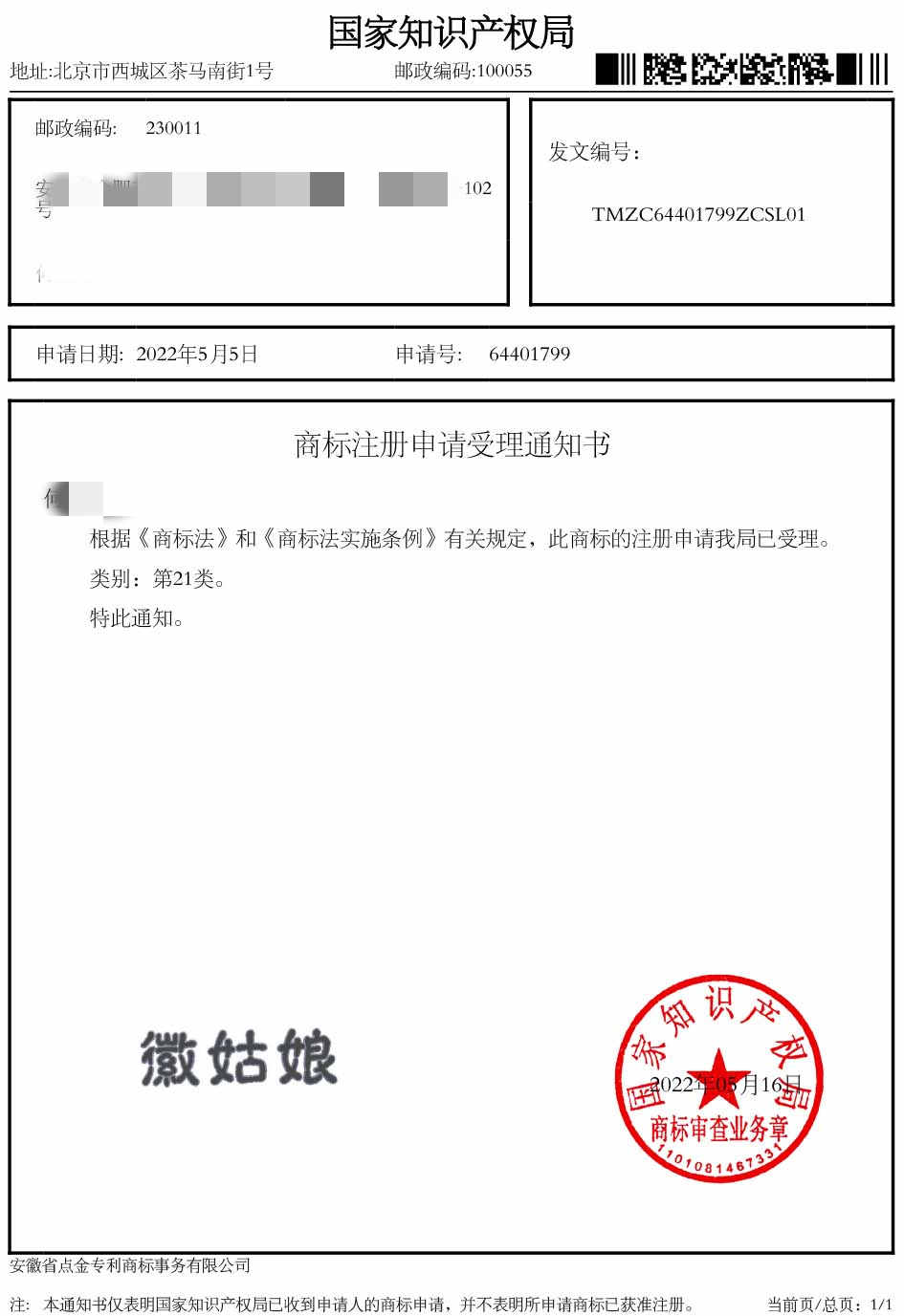 第21类“徽姑娘”商标受理通知书
