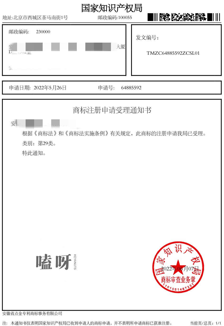 第29类“嗑呀 KEYANUTS”商标受理通知书