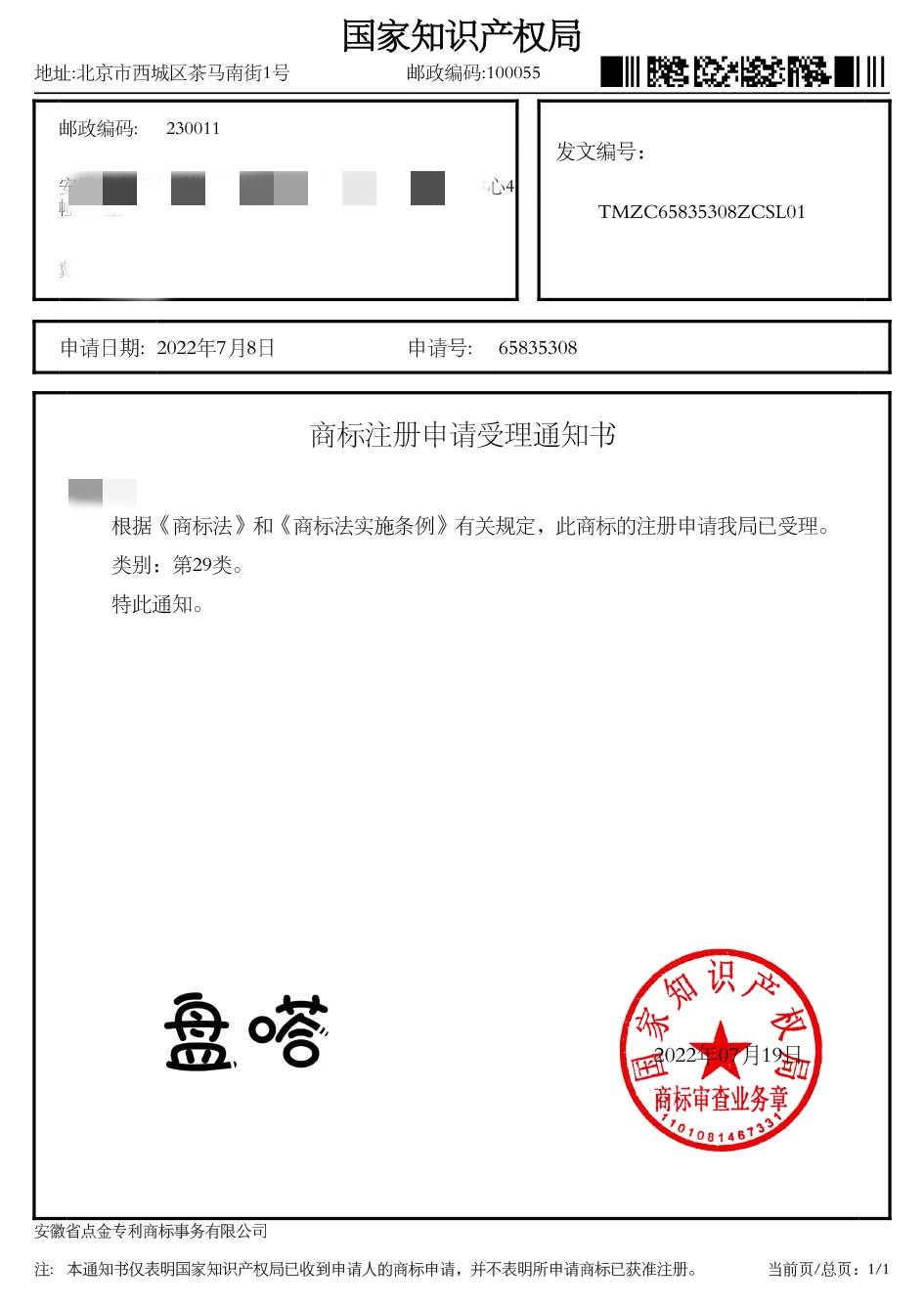 第29类“盘嗒”商标受理通知书