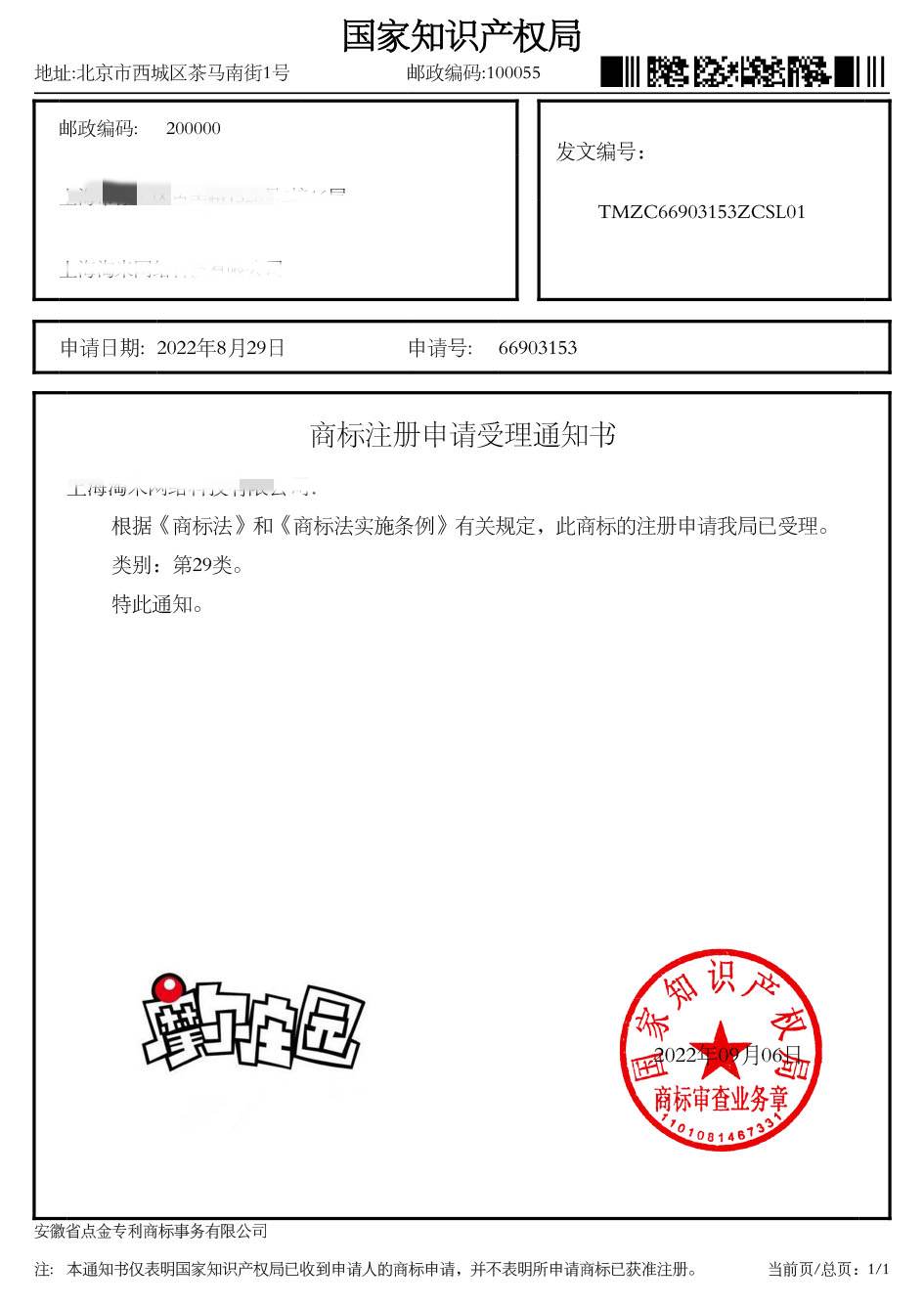 第29类“摩尔庄园”商标受理通知书