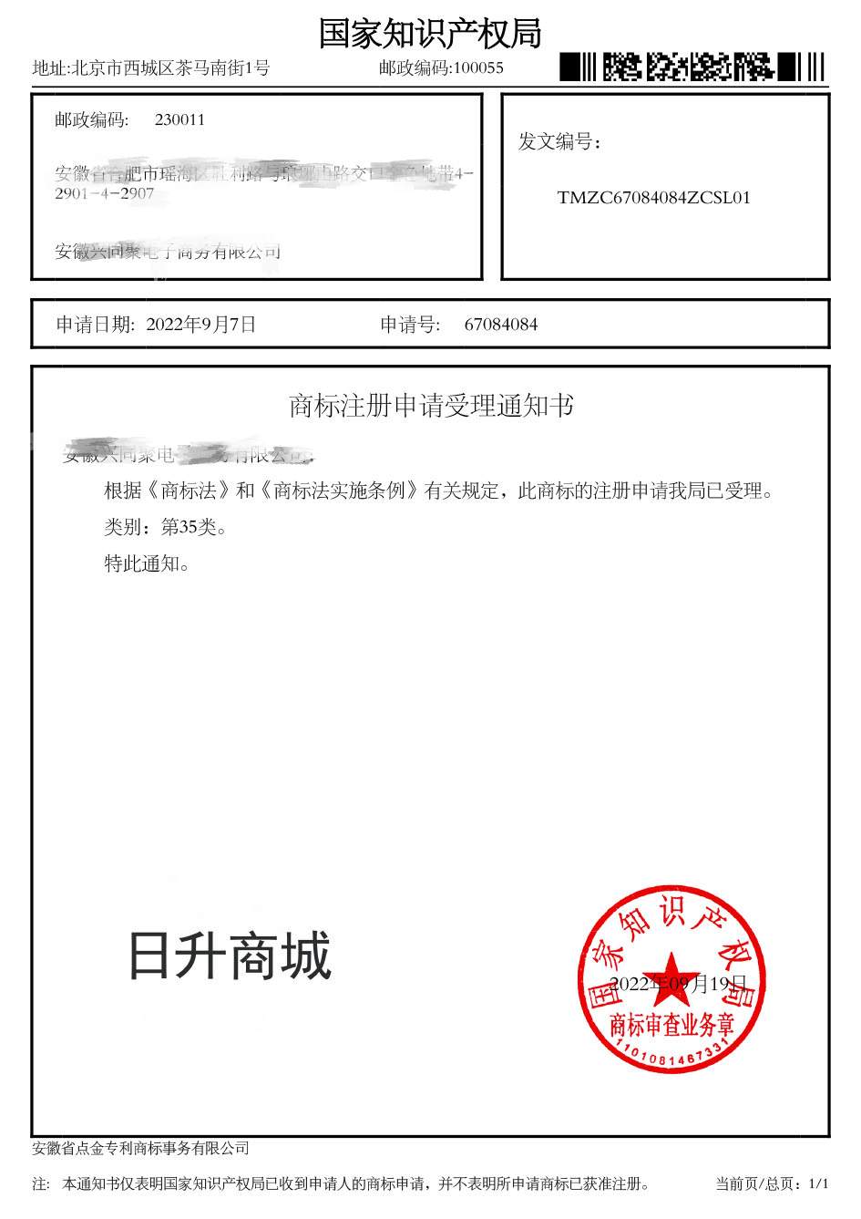 第35类“日升商城”商标受理通知书