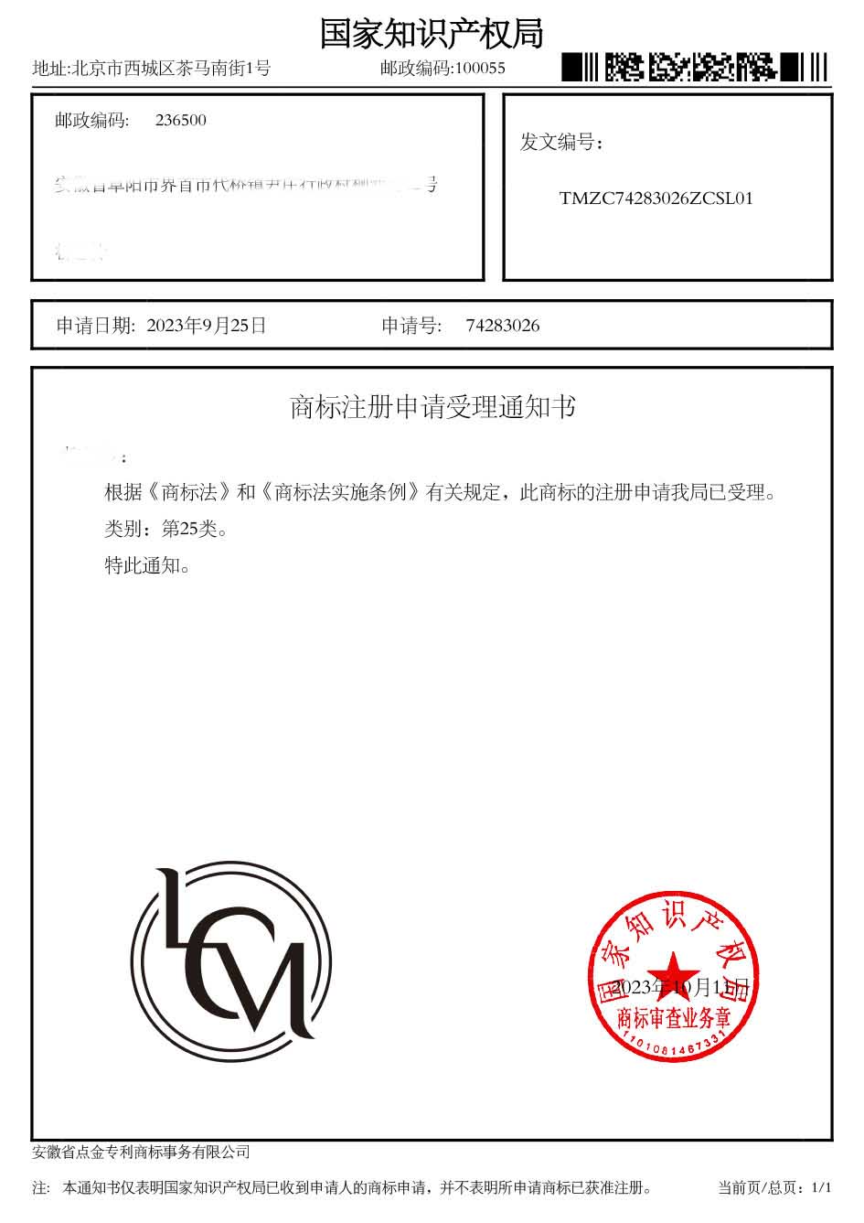 第25类“LCM”商标受理通知书