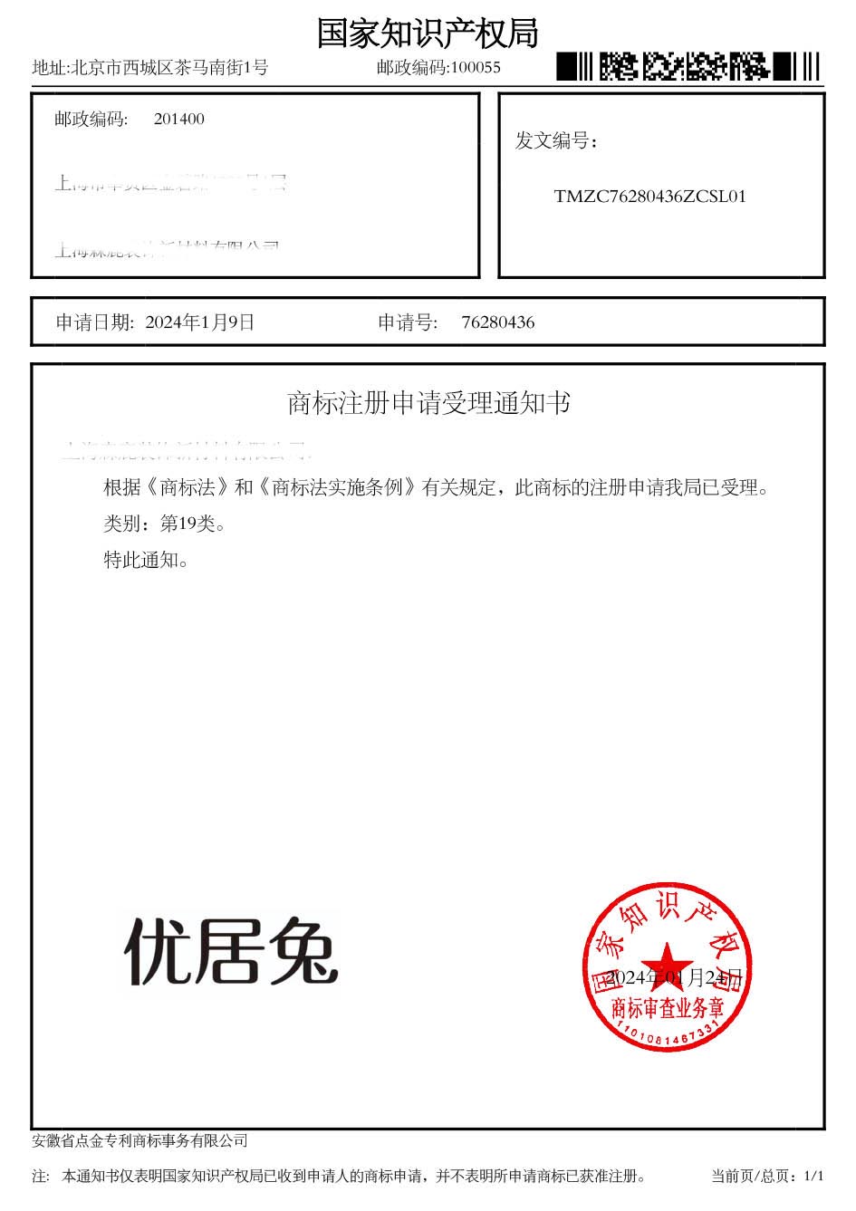 第19类“优居兔”商标受理通知书