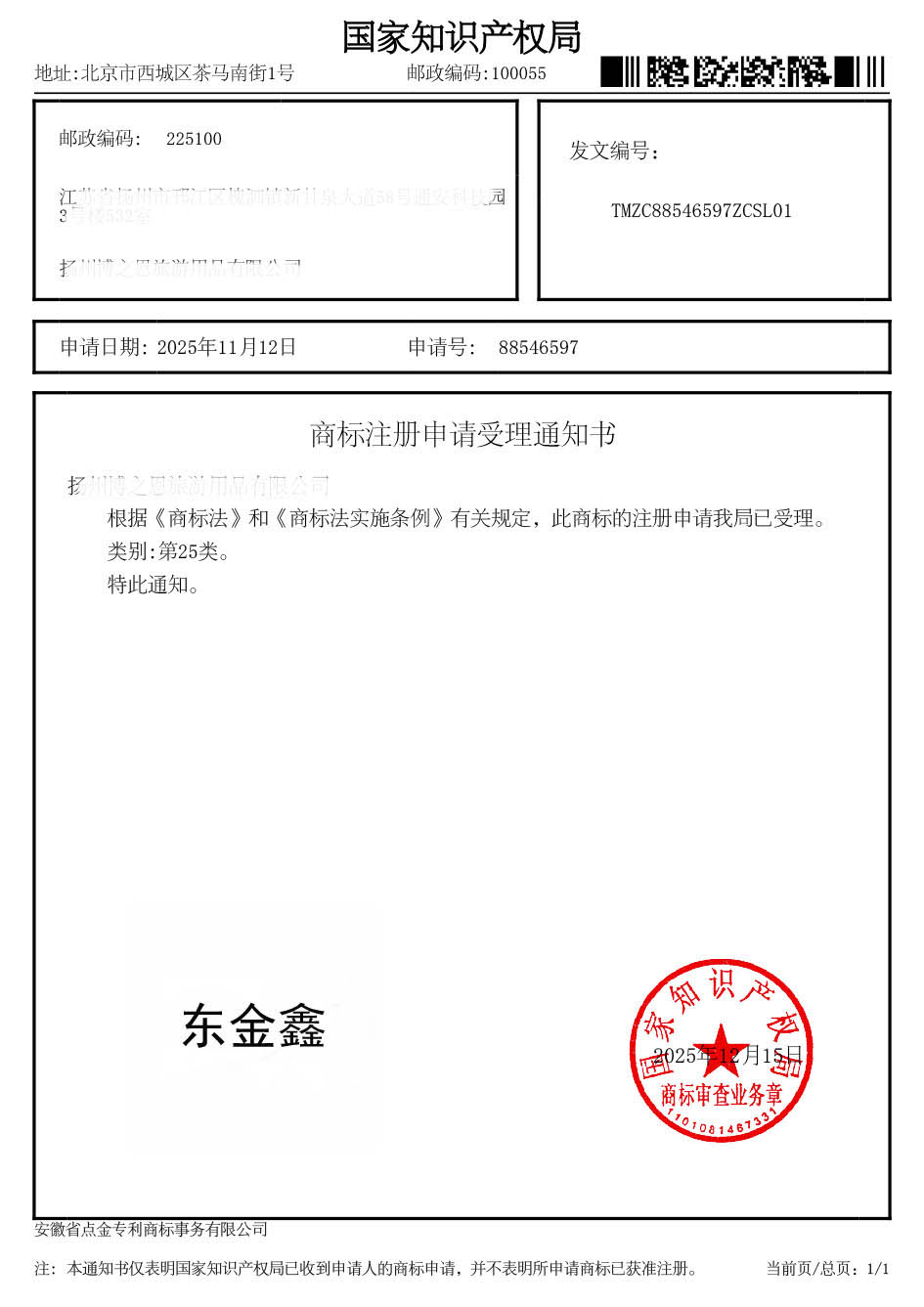 第25类“东金鑫”商标受理通知书