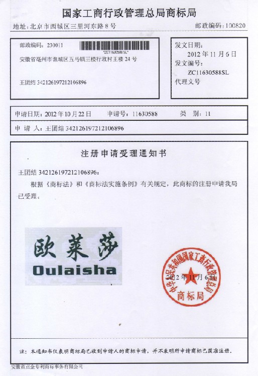 第11类“欧莱莎”受理通知书