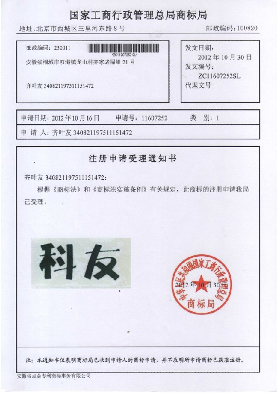 第1类“科友”受理通知书