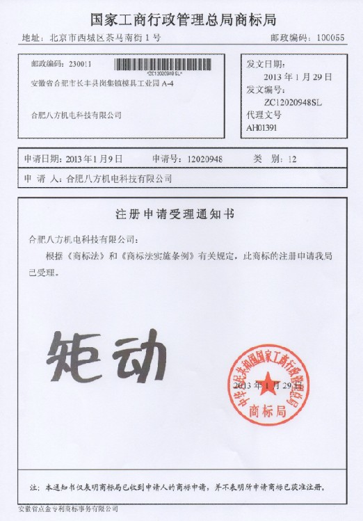 第12类“矩动”受理通知书