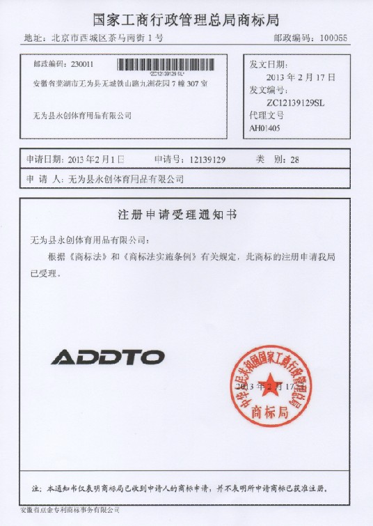 第28类“ADDTO”的商标受理通知书