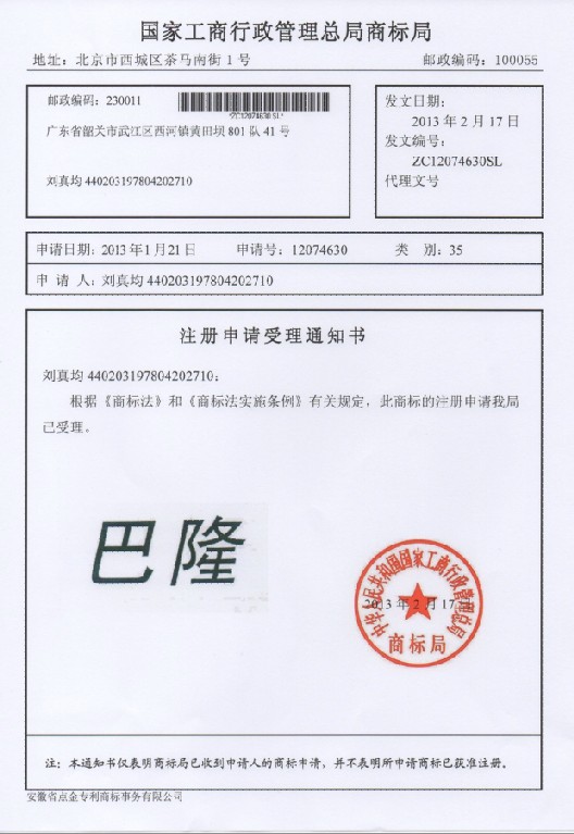 第6类“巴隆”商标受理通知书