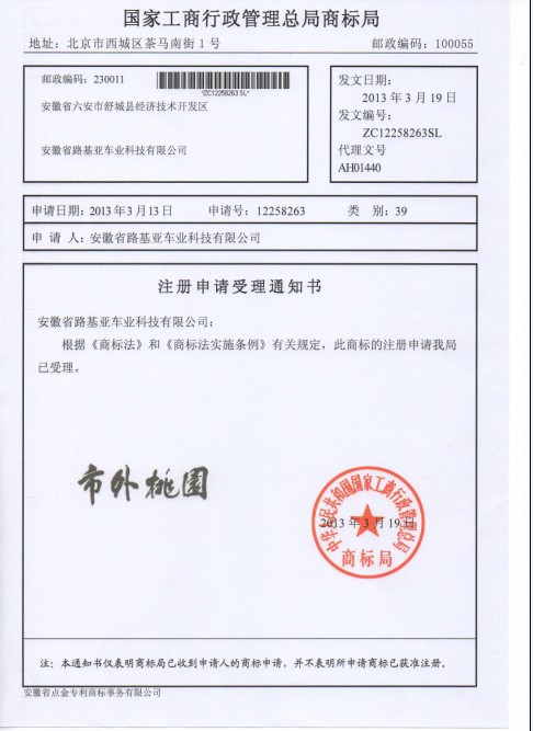 [合肥商标注册]安徽路基亚电动...