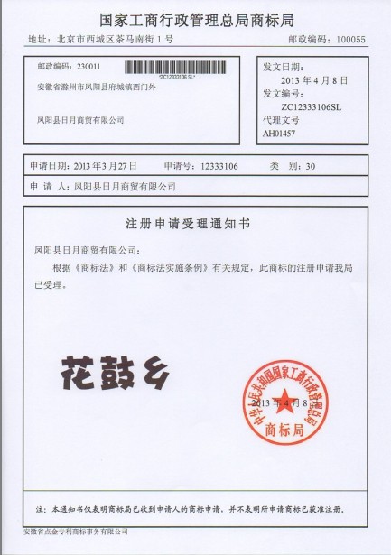 第30类“花鼓乡”商标受理通知书