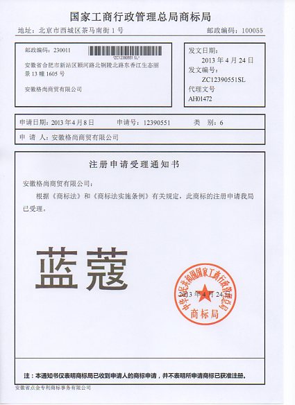 第6类“蓝蔻”商标受理通知书