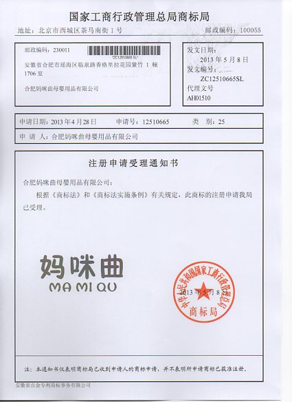 第25类“妈咪曲”商标受理通知书
