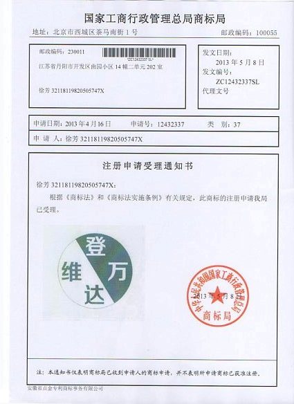 第37类“维登万达”商标受理通知书