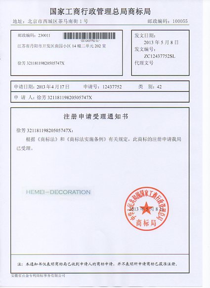 第42类“HEMEI-DECORATION”商标受理通知书