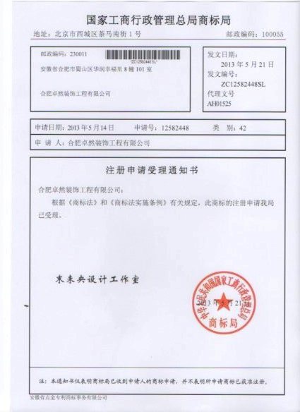 第42类“末未央设计工作室”商标受理通知书