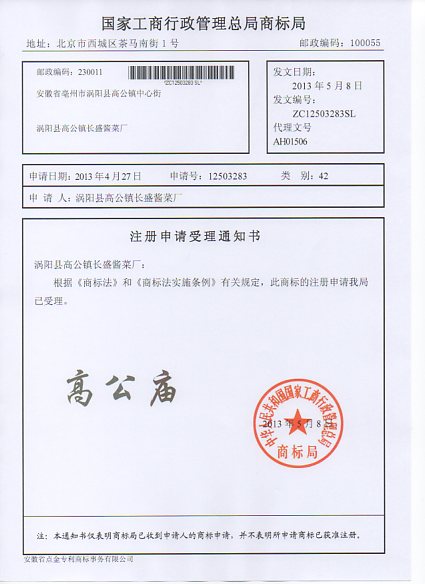 第42类“高公庙”商标受理通知书