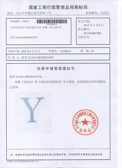 第35类“Y”商标受理通知书