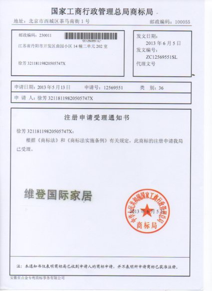 第36类“维登国际家居”商标受理通知书