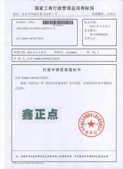 第2类“鑫正点”商标受理通知书