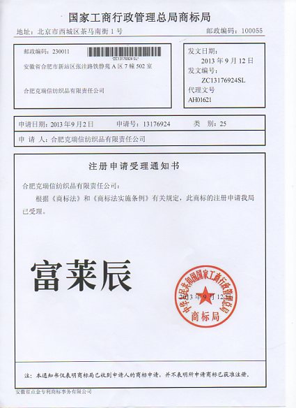 第25类“富莱辰”商标受理通知书